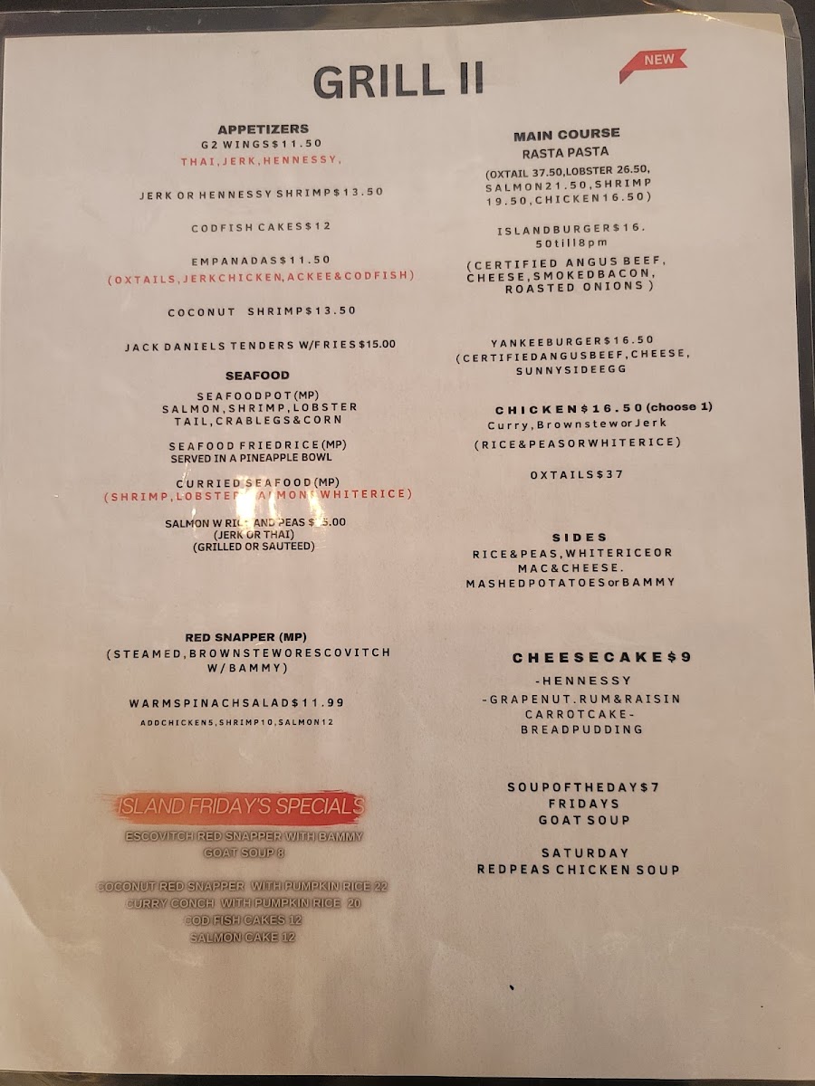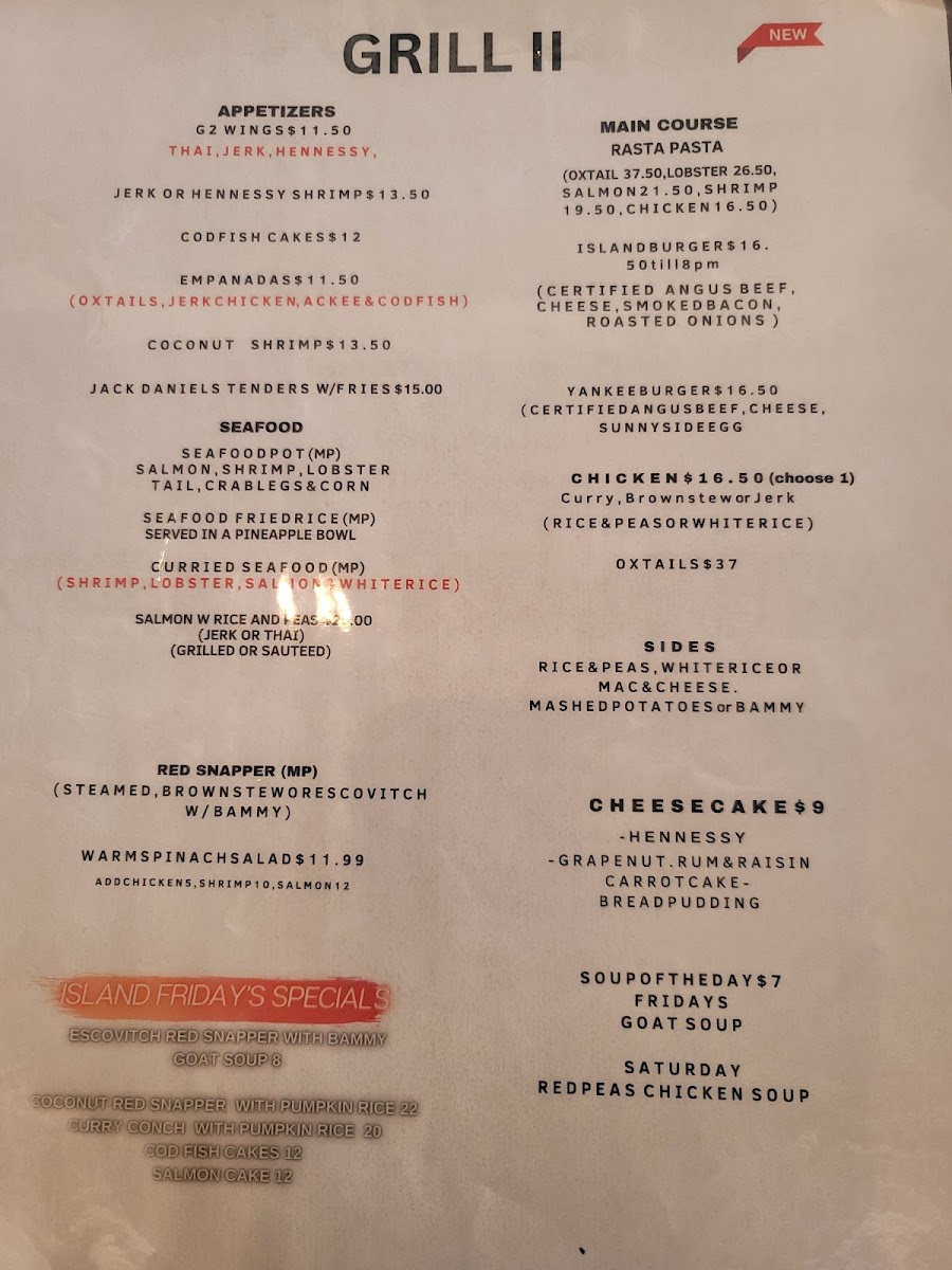 Penne Pasta, Alfredo Sauce, sauteed Peppers & Carribean spices. Mild or Spicy. Chicken $5, Shrimp $10, Salmon $10, Lobster $16, Oxtail $16, Seafood $22